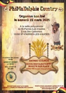 Le Samedi 28 Mars 2026, Bal Country des *Phimadelphie Country*, avec *Sundie*, à 20h00, Salle Polyvalente , 2 rue Ste Catherine, à St Parres les Va