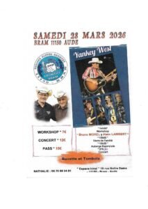Le Samedi 28 Mars 2026, Journée Country avec Workshop et Concert des *Yankey West*, à partir de 14h00, *Espace Idéal*, 18 rue Notre Dame, à Bram (11150), Aude.