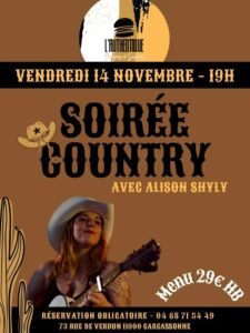 Le Vendredi 14 Novembre 2025, Soirée Country avec *Alison Shyly*, à 19h00, à L’Authentique, 73 rue de Verdun, à Carcassonne (11000), Aude.