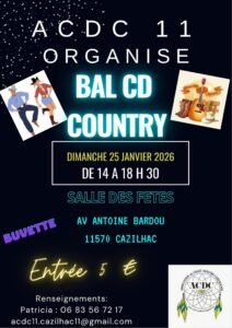 Le Dimanche 25 Janvier 2026, Après Midi Bal Country cd de 14h00 à 18h30, chez *ACDC 11*, Salle des Fetes , Avenue Antoine Bardou, à Cazilhac (11570), Aude.