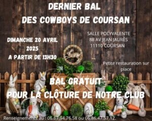 Le Dimanche 20 Avril 2025, Après Midi du Dernier Bal Country des *Cowboys de Coursan*, à partir de 13h30, Salle Polyvalente , 88 Avenue Jean Jaurès, à C