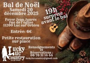 Le Samedi 20 Décembre 2025, Bal Country de Noel, chez *Lucky Luc Country*, à 19h00, Foyer Jean Jaurès, rue de L’église, à Luc sur Orbieu (11200), Aude.