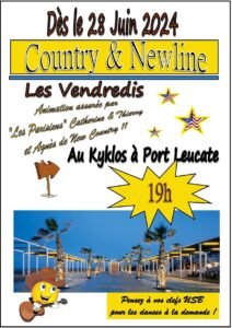 Le Vendredi 28 Juin 2024, Soirée Country et Newline à 19h00, au *Kyklos *, à Port Leucate (11), Aude.
