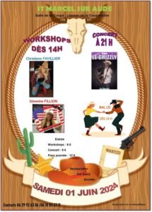 Le Samedi 1er Juin 2024, Journée Country dès 14h00, avec Workshops , Concert et Bal Country cd, Salle de la Coopé, Chemin de la Coopérative, à St Marcel sur Aude (11120), A