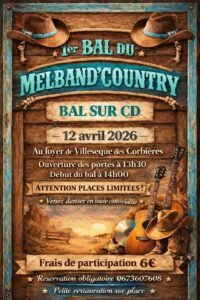 Le Dimanche 12 Avril 2026, Après Midi 1er Bal Country cd du *Melband’Country*, à 14h00, au Foyer de Vill