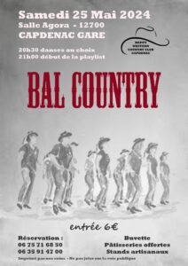 Le Samedi 25 Mai 2024, Bal Country à 21h00, chez *Happy Western Country Club*, Salle Agora, à Capdenac Gare (12700), Aveyron.