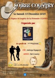 Le Samedi 13 Décembre 2025, Soirée Country pour le Téléthon, chez *Les 100 tiags de La Primaube*, à 20h30, Espace St Exupéry de Luc la Primaube (12
