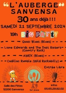 Le Samedi 21 Septembre 2024, Soirée Concerts Country Rock avec *Liane Edwards and The Dust Raisers*, *Awek, Cadillac Rumble*, pour les 30 ans de L’auberge Sa