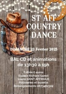 Le Dimanche 23 Février 2025, Après Midi Bal Country chez *St Aff Country Dance *, de 13h30 à 19h00, Espace Richard Sainct, à St Afrique (12400), Aveyron.