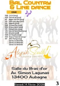 Le Samedi 14 Février 2026, Bal Country et Line Dance chez *Atypik South Country Dancer*, de 14h00 à 23h00, Salle du Bras D’or, Avenue Simon Lagunas, à Aubagne (13400), Bou