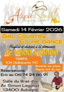 Le Samedi 14 Février 2026, Bal Country et Line Dance chez *Atypik South Country Dancer*, de 14h00 à 23h00, Salle du Bras D’or, Avenue Simon Lagunas, à Aubagne (13400), Bou