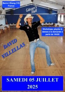 Le Samedi 05 Juillet 2025, Journée Country et CCS, avec Workshops de *David Villellas*, à partir de 14h00 , Playlist et Danses à la demande, au Gibson’s Hall, Quartier des Voltes à Berre L’etang (13130), Bouches du Rhone.