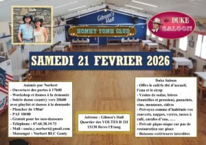 Le Samedi 21 Février 2026, Soirée Country animée par *Norbert*, à partir de 17h00 avec Workshop et Danses à la demande et Playlist à 20h00, au Gibson’s Hall Quartier de