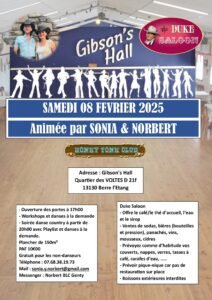 Le Samedi 08 Février 2025, Soirée Country animée par *Sonia et Norbert*, avec Workshops et Soirée Playlist, au *Gibson’s Hall, Quartier des Voltes, à Berre L’Etang (13130), Bouches du