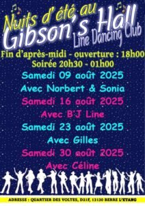 Le Samedi 09 Aout 2025, Soirée Country Line Dance avec *Norbert et Sonia*, de 20h30 à 01h00, au Gibson’s Hall , Quartier des Voltes, à Berre L’Etang (13130), Bouches du Rh