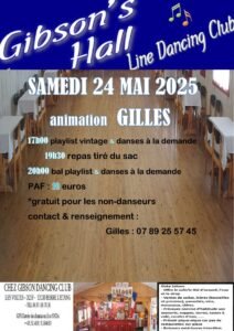 Le Samedi 24 Mai 2025, Soirée Line Country animée par *Gilles*, à partir de 17h00, avec Playlist Vintage jusqu’à 19h30 et Soirée à 20h00, au Gibson’s Hall Line Dancing Club, Quartier des Voltes, à Berre L’etang (13130), Bouches du Rhone.