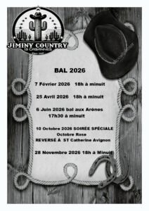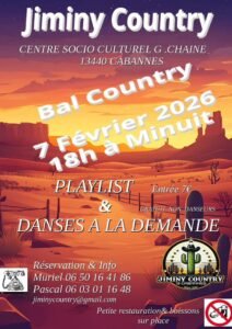 Le Samedi 07 Février 2026, Bal Country des *Jiminy Country*, de 18h00 à 00h00, à Cabannes (13), Bouches du Rhône.