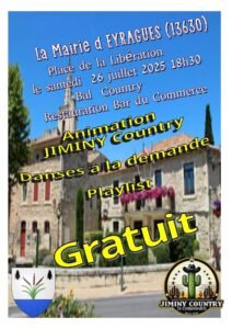 Le Samedi 26 Juillet 2025, Bal Country animé par *Jiminy Country*, à 18h30, Place de la Libération, à Eyragues (13630), Bouches du Rhone.