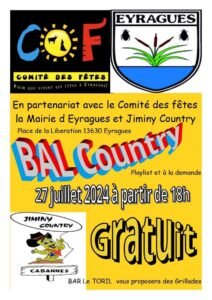 Le Samedi 27 Juillet 2024, Bal Country , organisé par *Jiminy Country* et le Comité des Fetes de la Mairie, à 18h00, Place de la Libération, à Eyragues (13630), Bouches du Rhone.
