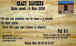 Le Samedi 14 Mars 2026, Soirée Country chez *Crazy Dancers*, à 19h00, au Saloon Horse City , RN 568 Quartier Bricart la Source, à Gignac la Nerthe (13180), Bouches du Rhône.