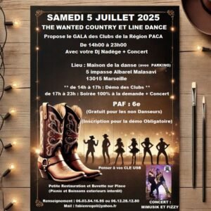 Le Samedi 05 Juillet 2025, Journée *Gala des Clubs de la Région Paca*, proposée par *The Wanted Country et Line Dance*, de 14h00 à 23h00, animée par *Nadège* et Concert de *MiMuZik et Fizzy*, Maison de la Danse, 5 Impasse Albarel Malasavi, à Marseille (13015),
