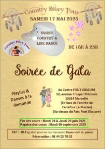 Le Samedi 17 Mai 2025, Soirée Country et Line Dance de Gala, chez *Country Story Tour*, de 18h00 à 23h00, au Centre Font Obscure, 50, Avenue Prosper Mérimée, à Marseille (13014), Bouches du Rhone.