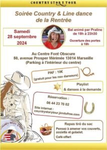 Le Samedi 28 Septembre 2024, Soirée Country et Line Dance animée par *Praline*, chez *Country Story Tour*, de 19h00 à 23h30, Centre Font Obscure , 50, Avenue Prosper Mérimée, à Marseille (13014), Bouches du Rhone.