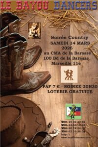 Le Samedi 14 Mars 2026, Soirée Country de *Le Bayou Dancers*, à 20h30, au CMA de la Barasse, 100 Boulevard de la Barasse, à Marseille (11eme), Bouches du Rhône.