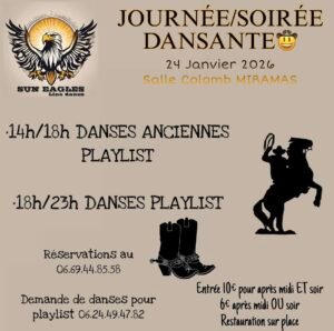 Le Samedi 24 Jaanvier 2026, Journée Country de 14h00 à 23h00, chez *Sun EaglesLine Dance*, avec Danses anciennes, Playlist , Salle Colomb, à Miramas (13), Bouches du Rhône