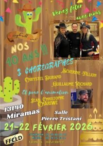 Les 21 et 22 Février 2026, Week End Country avec *Séverine Fillion*, *Chrystel Durand*, *Guillaume Richard* et *Jean Christophe Chariwe*, pour Fêter les 10 ans de notre Club, Salle Pierre Trist