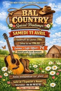 Le Samedi 11 Avril 2026, Bal Country à 19h30, chez *Les Nov’Country Dancers*, Salle de L’Espacier, à Noves (13), Bouches du Rhône.