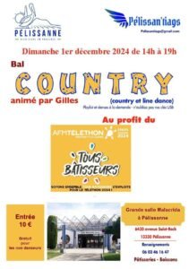 Le Dimanche 1er Décembre 2024, Après Midi Bal Country animée par *Gilles*, chez *Pelissan’ Tiags * pour le Téléthon,