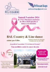 Le Samedi 05 Octobre 2024, Bal Country et Line Dance au profit de la ligue contre le Cancer, , animé par *Gilles*, de 19h00 à 23h30, Précédé d’e Danses Anciennes, de 17h00 à 19h00, Grande Salle Malacrida, 6430, Avenue St Roch, à Pelissanne.