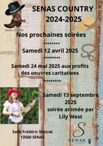 Le Samedi 12 Avril 2025, Soirée Country de *Senas Country*, Salle Frédéric Mistral, à Senas (13560), Bouches du Rhone.