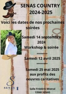 Le Samedi 14 Septembre 2024, Soirée Country, avec Workshop et Bal, Salle Frédéric Mistral, à Senas (13560), Bouches du Rhone.