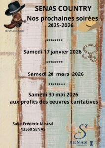 Le Samedi 28 Mars 2026, Soirée Country chez *Senas Country*, Salle Frédéric Mistral , à Senas (13560), Bouches du Rhone.