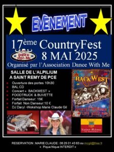Le Jeudi 08 Mai 2025, 17 ème Country Fest des *Dance With Me*, à 10h30, avec Bal cd, Concert des *Backwest* et Workshop de *Marie Claude Gil*, Salle de L’Alpilium, à St Remy de Provence (13) Bouches du Rhone.