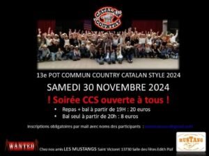 Le Samedi 30 Novembre 2024, Soirée 13 ème Pot Commun CCS chez *Les Mustangs*, avec Repas et Bal à partir de 19h00, Salle des Fetes Edith Piaf, à St Victoret