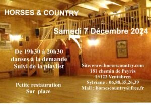 Le Samedi 07 Décembre 2024, Soirée Country à partir de 19h30 , chez *Horses & Country*, 181, Chemin de Peyrès, à Ventabren (13122), Bouches du Rhone.