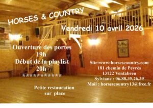 Le Vendredi 10 Avril 2026, Soirée Country chez *Horses & Country*, à 20h00, 181 Chemin de Peyrès, à Ventabren (13122), Bouches du Rhône.