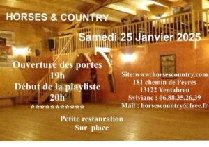 Le Samedi 25 Janvier 2025, Soirée Country à 20h00, chez *Horses & Country*, à 20h00, 181, Chemin de Peyrès, à Ventabren (13122), Bouches du Rhone.