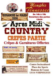 Le Dimanche 1er Mars 2026, Après Midi Bal Country Crêpes Party, de 14h00 à 19h00, Centre Socio Culturel Place des Sports, Hameau de Cazan, à Vernegues (13116), Bouches d