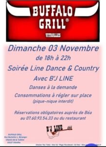 Le Dimanche 03 Novembre 2024, Soirée Line Dance et Country , de 18h00 à 22h00, avec *B’J Line*, au Buffalo Grill , rue Bachelier L.Béranger, Chemin de la Tuilière , à V