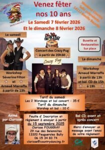 Les Samedi 07 et Dimanche 08 Février 2026, Week End Country chez *Country Dancing*, qui Fetera ses 10 ans, avec Workshops de *Séverine Fillion et Arnaud Marraffa*, Concert de *Crazy Pug*, Bal cd, Salle Polyvalente de Ble