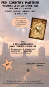 Le Dimanche 20 Septembre 2026, Après Midi Bal Country cd chez *Fun Country Partner*, de 14h00 à 19h00, Omac 2 rue Arthur Leduc, à Courseulles sur Mer (14470), Calvados.
