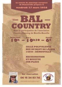 Le Vendredi 27 Mars 2026, Bal Country proposé par *Le Comité de Jumelage Europeen*, avec *Country Dancing *, à 19h30, Salle Polyvalente, rue du Bout de Là-Bas, à Démouville (14840), Calvados.