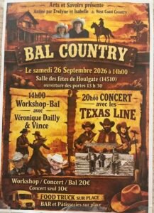 Le Samedi 26 Septembre 2026, Journée Country animée par *Evelyne et Isabelle*, chez *West Coast Country*, à partir de 14h00, avec Workshop et Bal , suivi d’un Concert des *Texas Line *