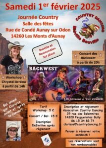 Le Samedi 1er Février 2025, Journée Country à partir de 14h00, avec Workshop de *Chrystel Arréou*, Bal Animé par *Clarisse*, Concert des *Backwest* à 20h00, Salle des Fetes, rue de Condé Aunay sur Odon, Les Monts D’aunay (14260), Calvados.