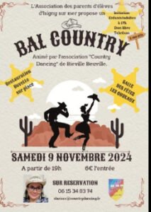 Le Samedi 09 Novembre 2024, Bal Country organisé par *L’Ape* et animé par L’association *Country Dancing* , à 19h00, Salle des Fetes de Les Oubeaux (14230), Calvados.