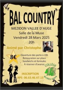 Le Vendredi 28 Mars 2025, Bal Country animé par *Christophe*, à 20h00, Salle de la Muse, à Mezidon Vallée D’Auge (14), Calvados.